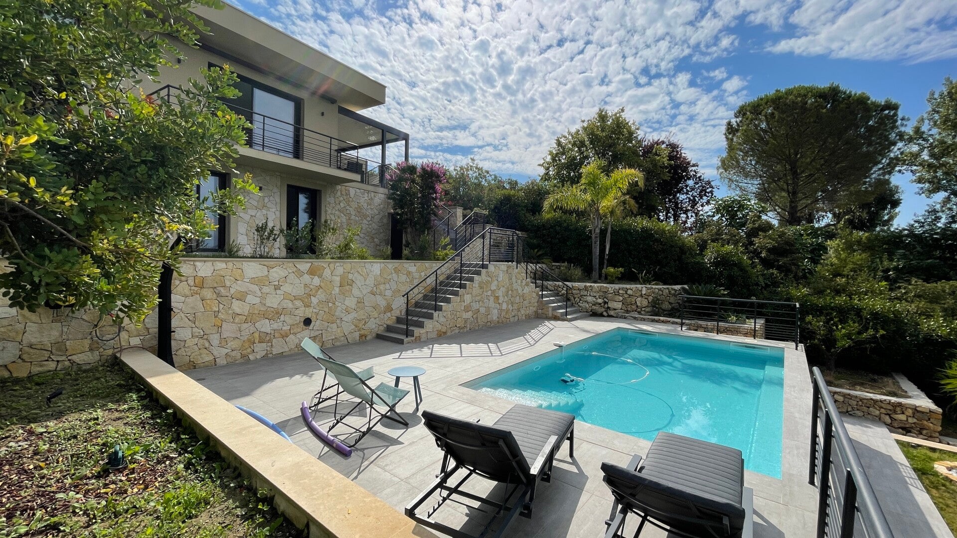 This fully air-conditioned villa with 4 bedrooms and 2 bathrooms sleeps a total of 6 guests. The bedrooms, all located on the same floor with direct access to the garden, have panoramic views.The living room and ground-floor terrace, featuring an electrically operated pergola, offer breathtaking views of the sea, mountains, and the charming medieval village of Tourrettes. In the meticulously designed garden, you'll find yourself stepping into the inviting pool area, complete with sun loungers and a pergola covering a relaxing chill-out lounge.